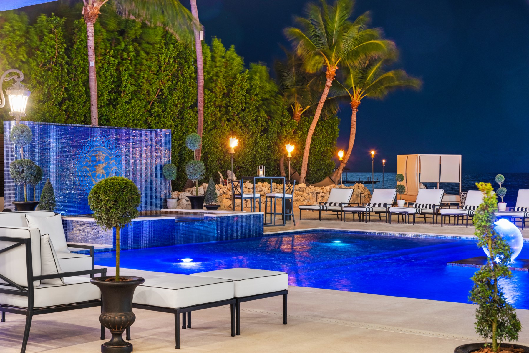 Relax after a good workout in our villa style mosaic pool & spa and let the cascading waterfall globes hypnotize you into a tranquility trance. Enjoy a movie or sports game from our 300” theater LED screen poolside with stunning ocean views. You may also want to lose yourself in one of our hammocks under the palm trees throughout the beach.